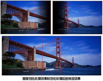 融合帶的羽化處理是將兩個投影機(jī)投射畫面的重疊部分,分別做圖像強(qiáng)度的連續(xù)而非線性變化,讓兩個投影機(jī)投射的畫面重疊部分圖像強(qiáng)度與融合帶兩側(cè)沒有經(jīng)過重疊部分的圖像強(qiáng)度相一致, 產(chǎn)生色彩一致的融合畫面。