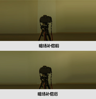 投影機(jī)的漏光,是指投影圖像為全黑色的時候,投影機(jī)仍舊有一部分光線能投射到投影幕上。這樣兩臺投影疊加以后,在純黑場的時候會出現(xiàn)一個中間亮帶。融合器需要用提升非疊加部分光強(qiáng)的方式,來抵消亮帶,這一個過程為暗場補(bǔ)償。